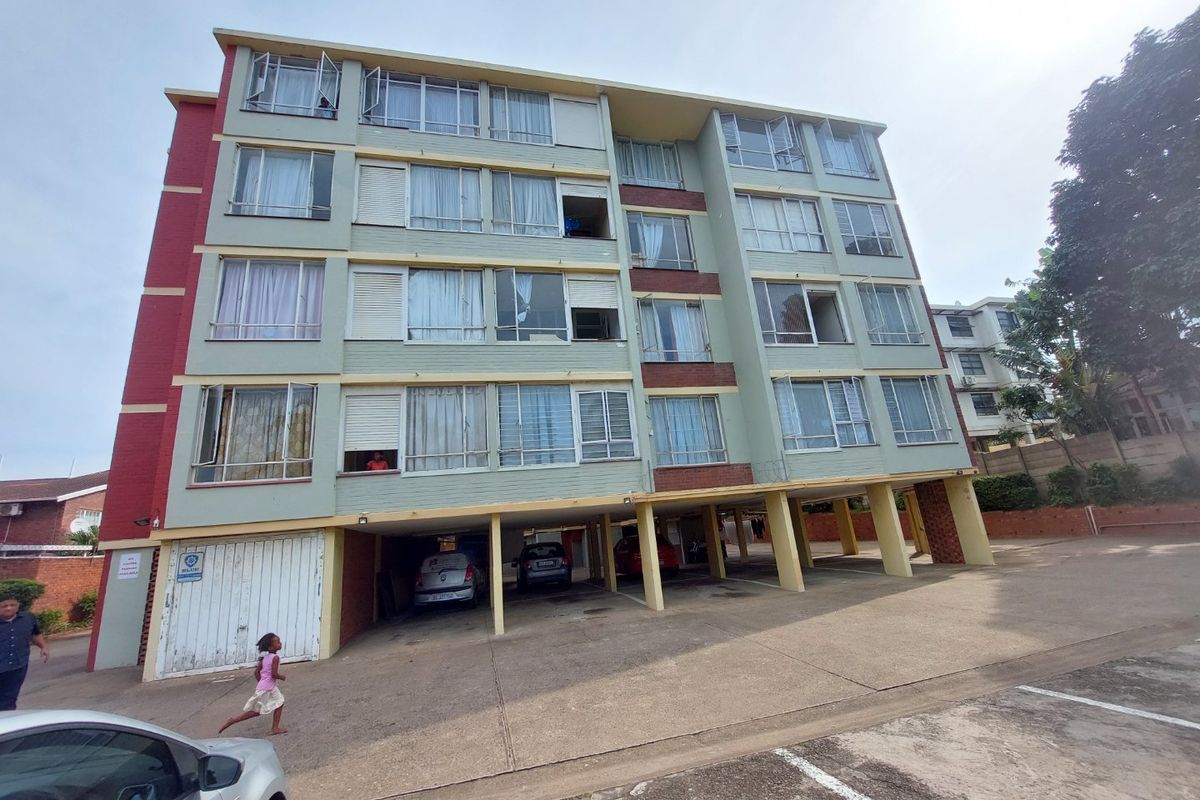 Urban convenience steps from Greyville Racecourse, Spar and Clarence Primary — open-plan bachelor apartment with modern fitted kitchen and built-in cupboards, bathtub with shower, one bed/one bath.