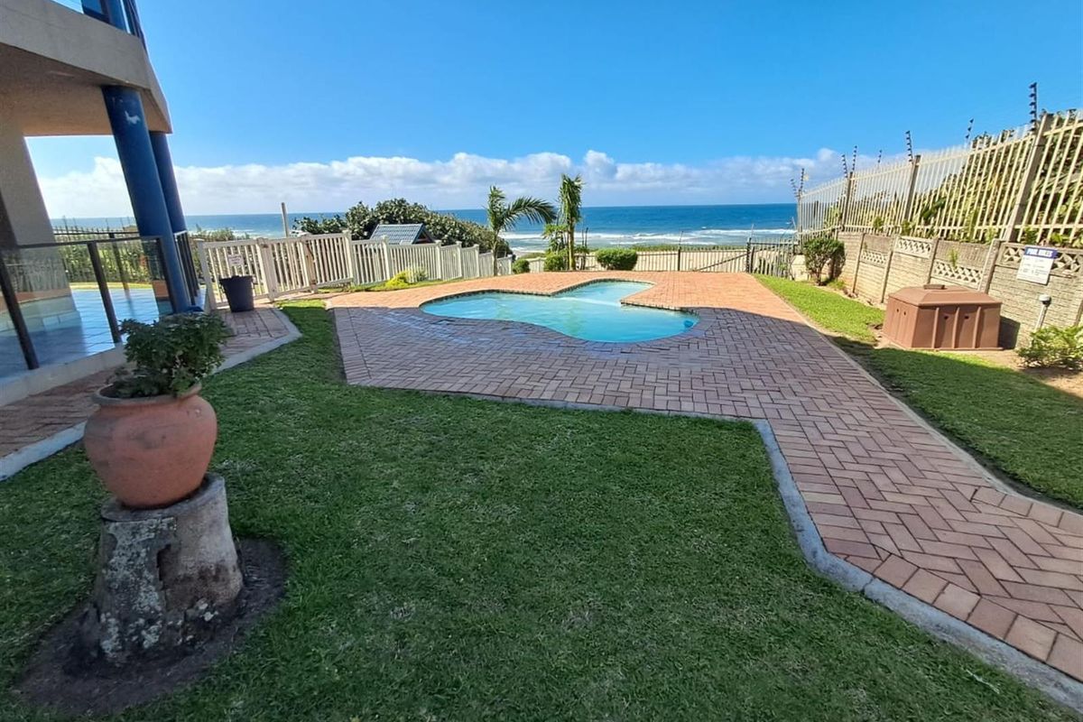 Seaside living with direct beach access in Margate, KwaZulu-Natal — ground-floor apartment featuring an enclosed braai room and communal pool, with two bedrooms, two bathrooms and lock-up garage.