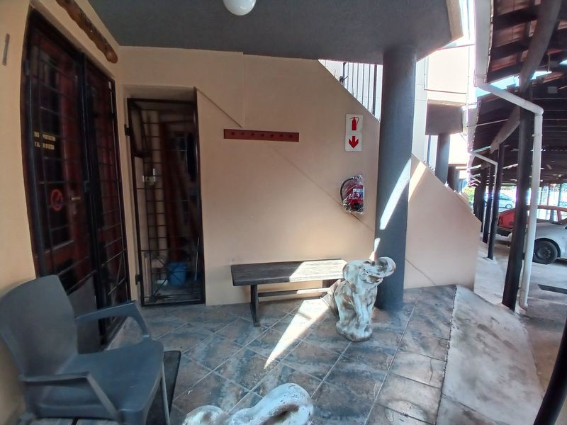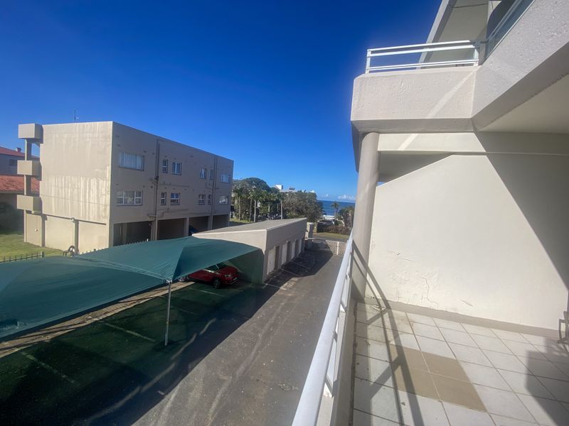Coastal lifestyle in Uvongo Square, steps from beaches, cafes and shops. First-floor, fully furnished one-bedroom with side sea view and covered parking — move-in ready.