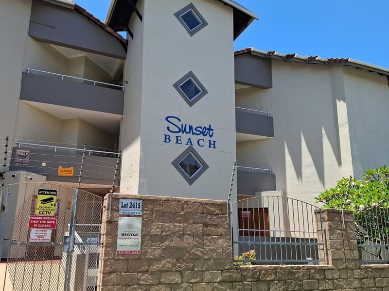 Coastal lock-up-and-go lifestyle in Sunset Beach, Uvongo — walking distance to beach and shops, open-plan kitchen and lounge with side sea views; two bedrooms, one bath.