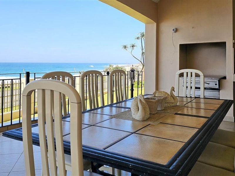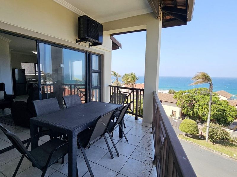Coastal holiday living on Uvongo Main Beach with panoramic sea views from every room, private patio and granite kitchen; fully furnished two-bedroom, one-bath apartment ideal for letting.