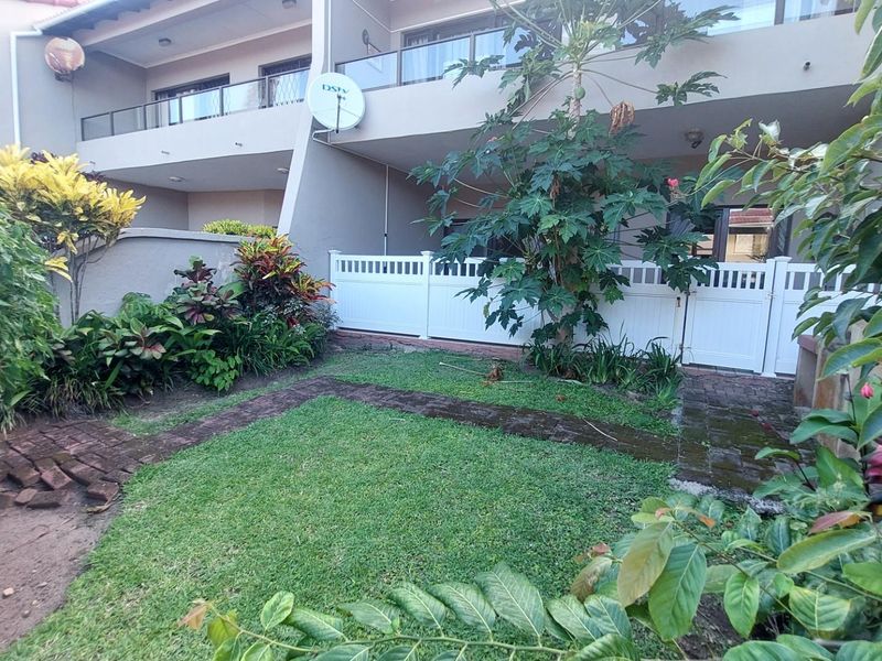 Relaxed coastal living in secure Uvongo, a 500m stroll to the beach, with private garden terrace and built-in braai; ground-floor two-bedroom, two-bath with single garage.