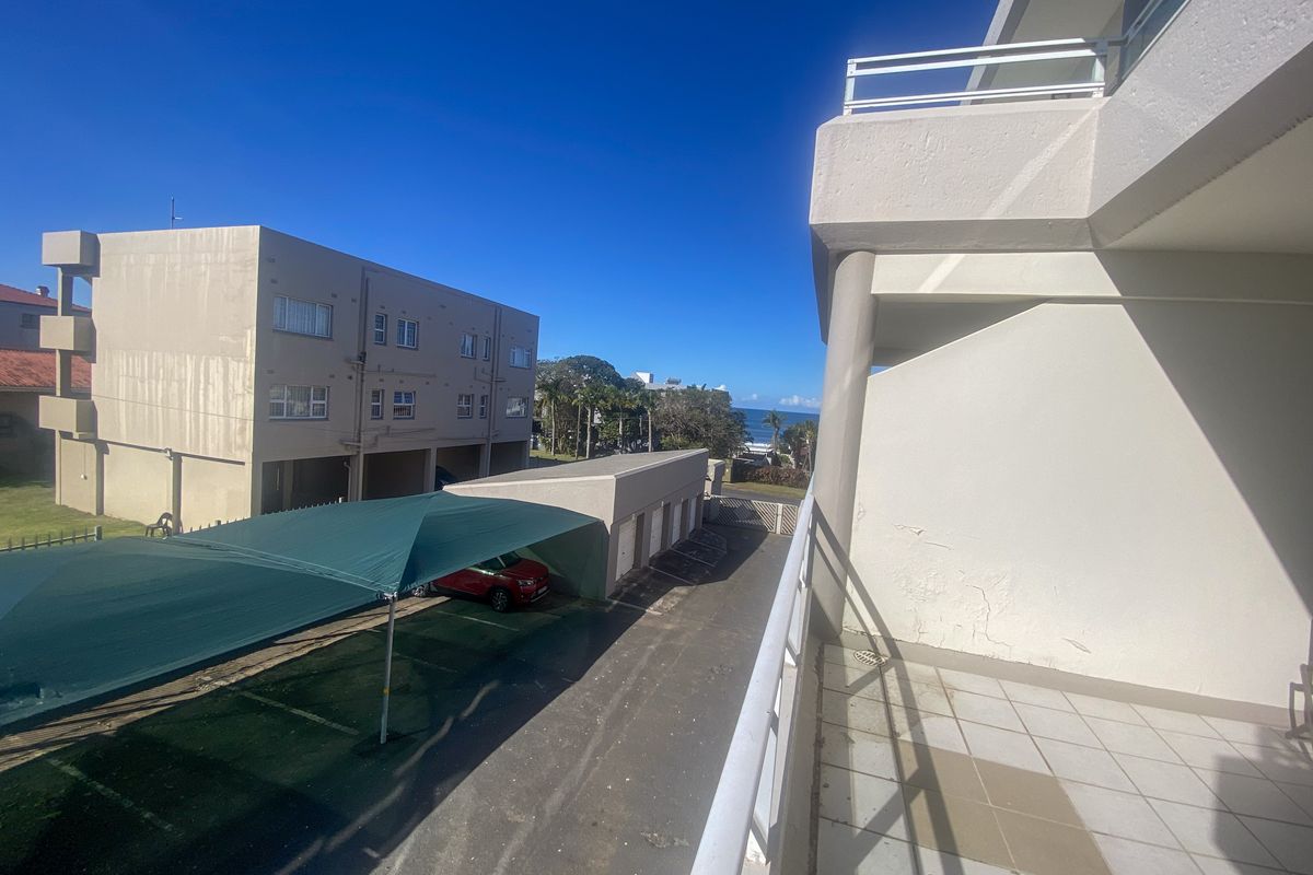 Coastal lifestyle in Uvongo Square, steps from beaches, cafes and shops. First-floor, fully furnished one-bedroom with side sea view and covered parking — move-in ready.