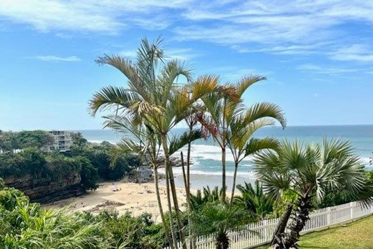 Seaside living steps from Uvongo Beach with panoramic sea views from a spacious covered balcony; newly renovated with quartz-topped kitchen island. Three bedrooms, two bathrooms, sold furnished.