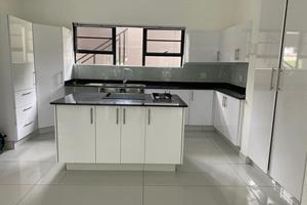 Resort-style estate living in Palm Lakes Estate, Ballito — ground-floor townhouse with private garden patio and modern open-plan kitchen, ideal for families; three bedrooms, two bathrooms.