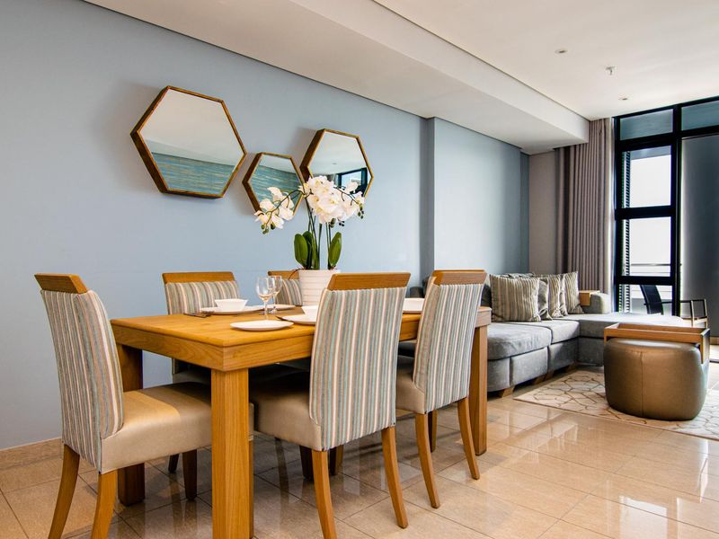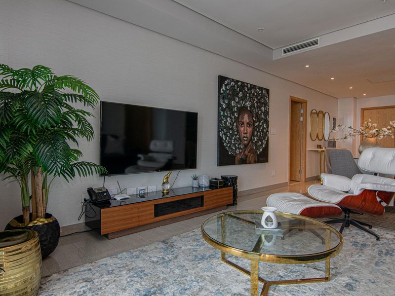 Wake to city lights and sweeping sea views in Pearls of Umhlanga, steps from The Pearl Mall; fully furnished two-bedroom, two-bathroom apartment with balcony and covered parking.