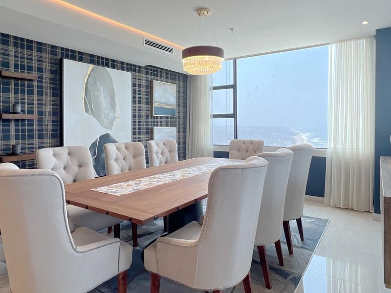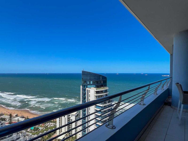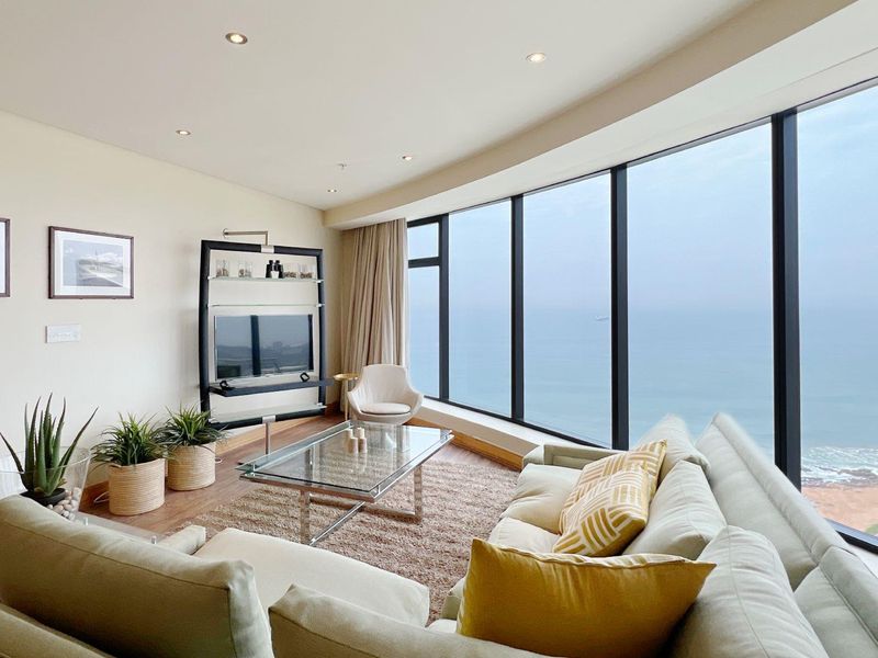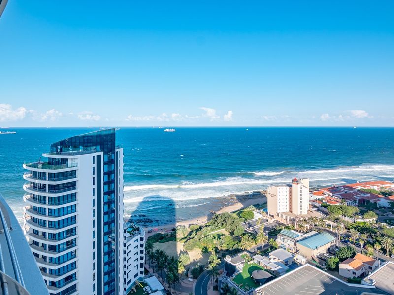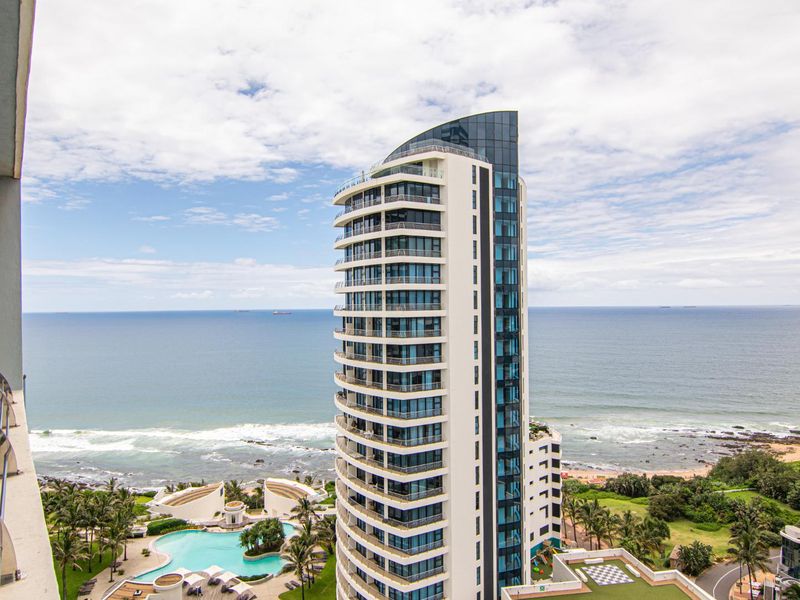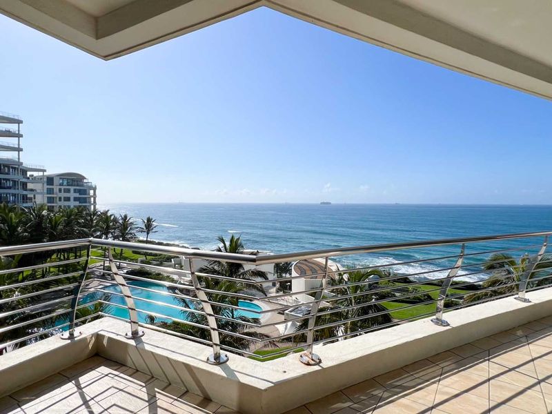 Resort-style coastal living in Umhlanga, steps from Pearls Mall and the promenade, with a sprawling 35m² balcony offering sweeping ocean views; fully furnished, three en-suite bedrooms, two covered parking