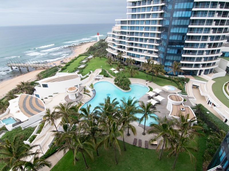 Effortless beachfront living in Pearls of Umhlanga — enjoy a private balcony with panoramic Indian Ocean views, onsite pools and mall access; one bedroom, 1.5 baths, covered parking.