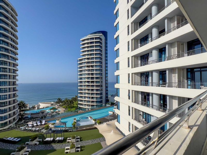 Resort-style living in Umhlanga with sea-view balcony and hotel-standard furnishings; direct Pearls Mall access, 24-hour biometric security, undercover parking and two bedrooms, two bathrooms.
