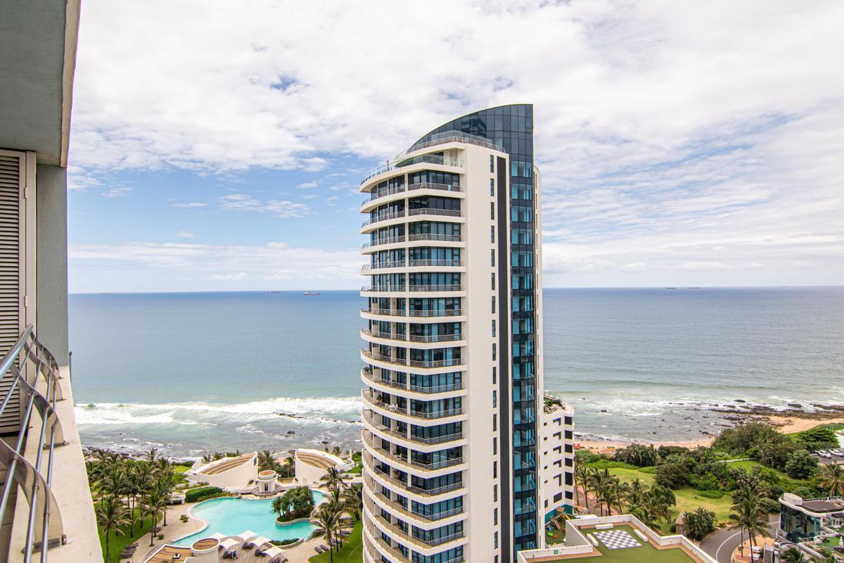 Wake to city lights and sweeping sea views in Pearls of Umhlanga, steps from The Pearl Mall; fully furnished two-bedroom, two-bathroom apartment with balcony and covered parking.