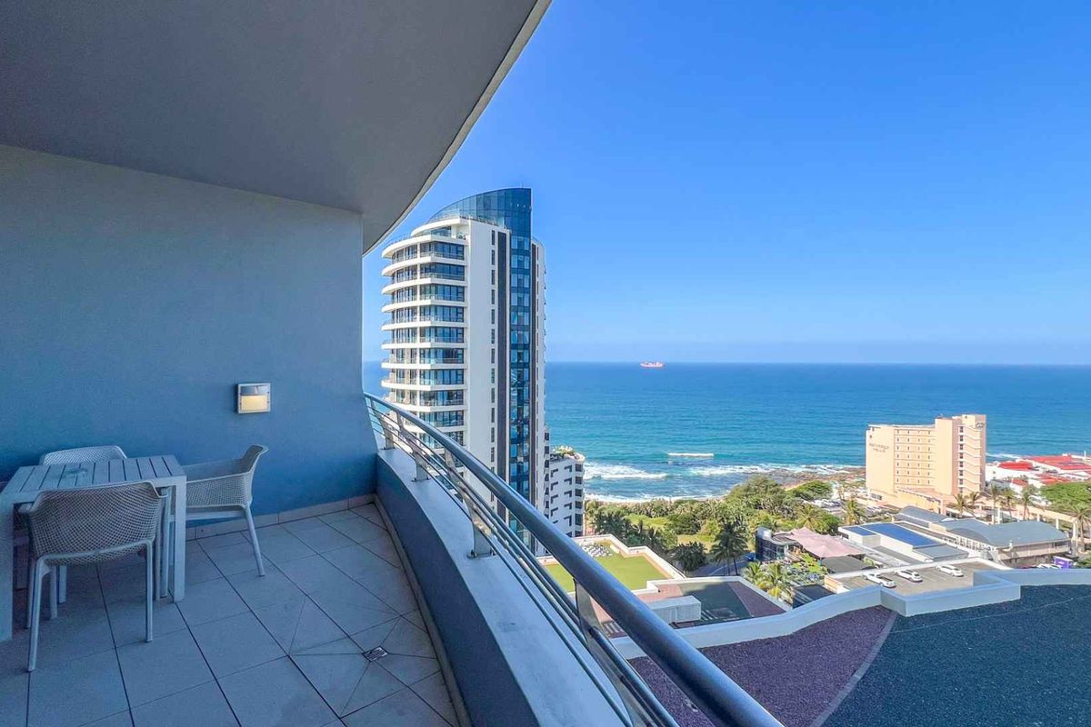 Wake to sunrise over Umhlanga Beach from a balcony with panoramic sea views; open-plan living, modern kitchen, two en-suite bedrooms, secure parking, and direct promenade/mall access.