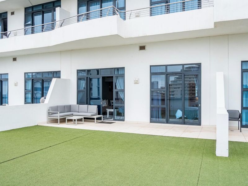Directly on Umhlanga Beach, this ground-floor family apartment offers a 38m² patio and private lawn for children, resort-style pool with sea views — two en-suite bedrooms, covered parking.