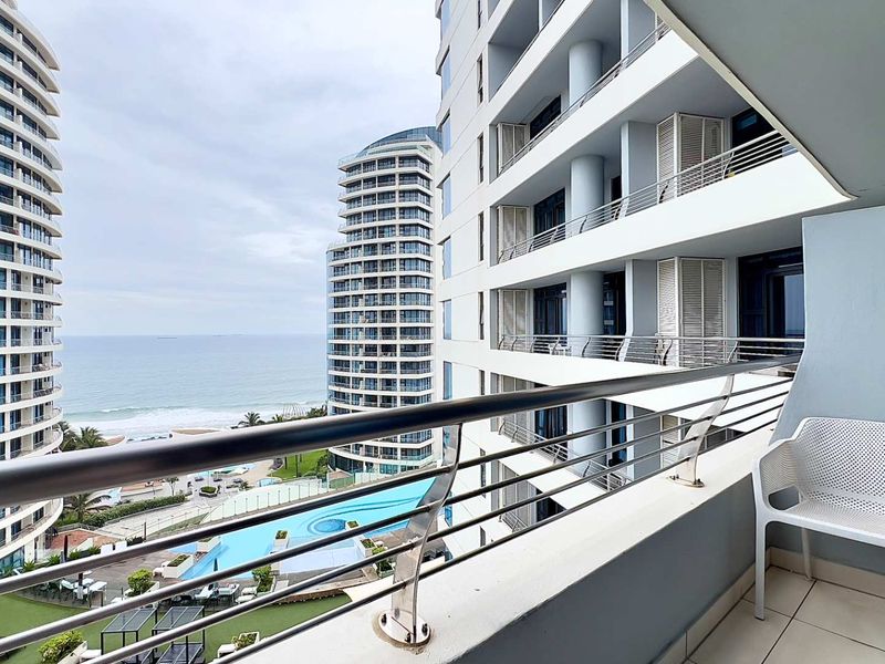 Ocean-view living in Umhlanga with an 11m2 balcony, move-in-ready fully furnished interiors, direct Pearls Mall access and a beach elevator — two bedrooms, two bathrooms, secure parking.