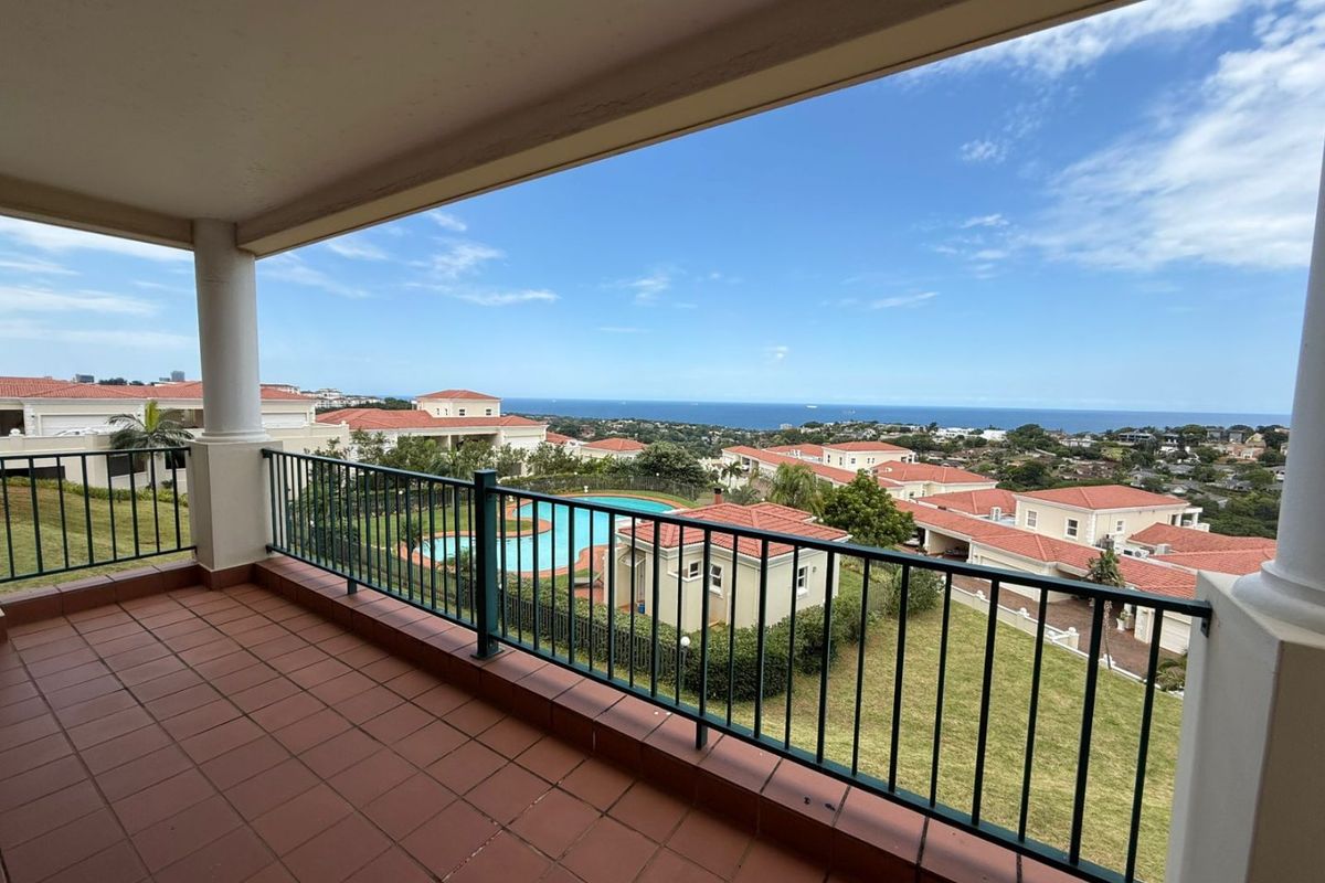 Elevated coastal living in La Lucia Ridge with endless sea views from a spacious balcony overlooking manicured gardens and pool; ultra-modern kitchen, three ensuite bedrooms and double automated garage.