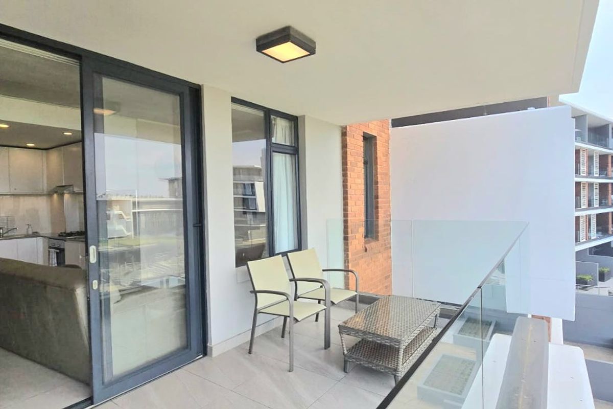 The unit features an open-plan kitchen and lounge area that flows onto a private balcony, creating a bright and airy living space. The kitchen is fitted with contemporary finishes and ample cupboard space. The bedroom is well-sized with built-in cupboards, and the bathroom is modern and neatly appointed.