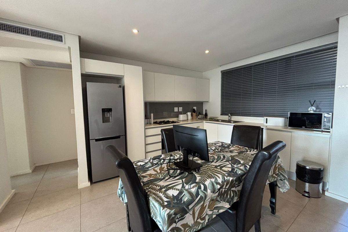 The unit features an open-plan kitchen, lounge, and dining area that flows onto a private balcony, creating a light and airy living space. The kitchen is fitted with modern finishes and ample cupboard space. Both bedrooms are well-sized with built-in cupboards, with the main bedroom offering an en-suite bathroom.