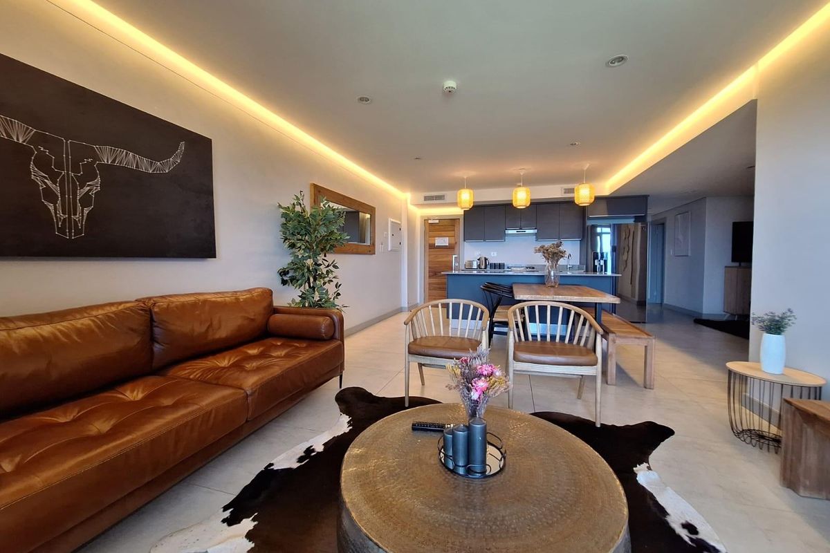 Coastal retreat with panoramic 180° sea views, airy open-plan living and modern stone-counter kitchen flowing to a large balcony. Communal pool and braai; three bedrooms, three bathrooms.
