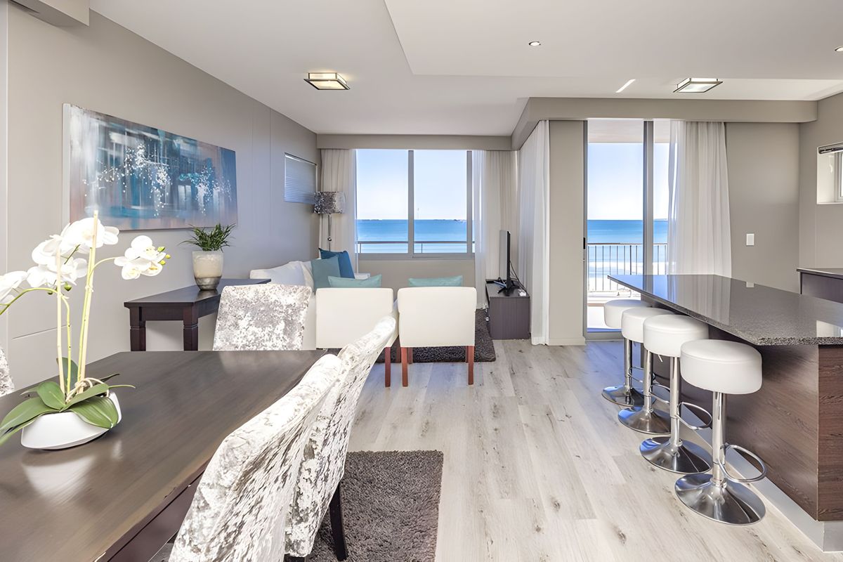 Sunset living steps from Blouberg beach, with uninterrupted Atlantic and Table Mountain views and a private balcony splash pool — fully furnished lock-up-and-go, two bedrooms, secure parking.