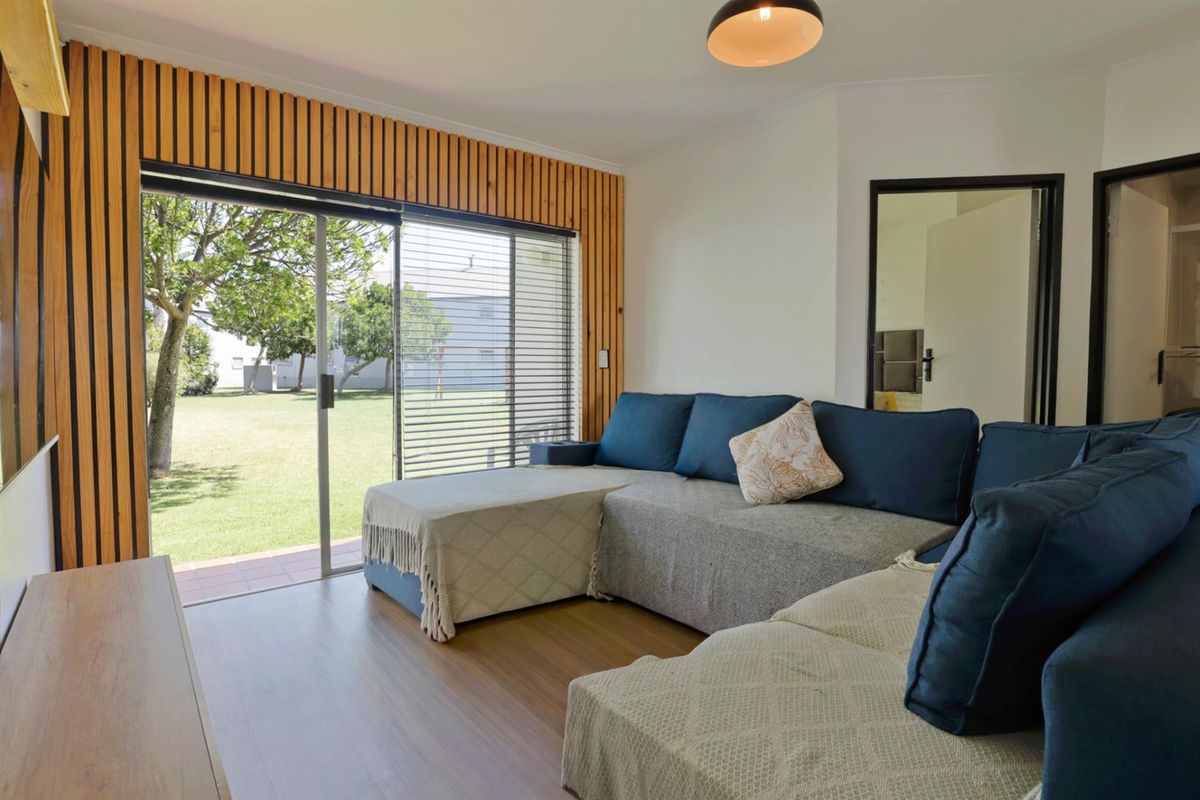 Enjoy coastal convenience in Blue Mountain Bay, minutes from Bloubergstrand and Table Mountain views — renovated ground-floor flat with covered patio overlooking communal garden and playground, modern kitchen.