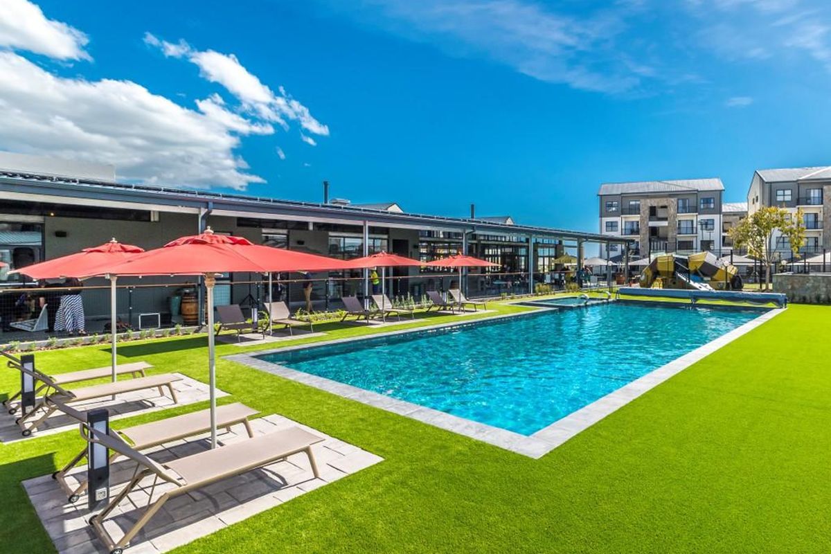 Resort-style living in award-winning Fynbos Lifestyle Estate with pool, gym and scenic walking trails; bright open-plan apartment boasts a private balcony with tranquil views, two beds, two baths.