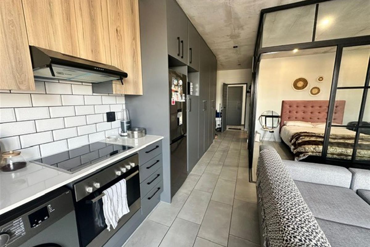City lock-up-and-go living with Table Mountain views, industrial-chic bedroom and high concrete ceilings. Contemporary kitchen, solar geyser and prepaid meters — one bedroom, one bathroom.