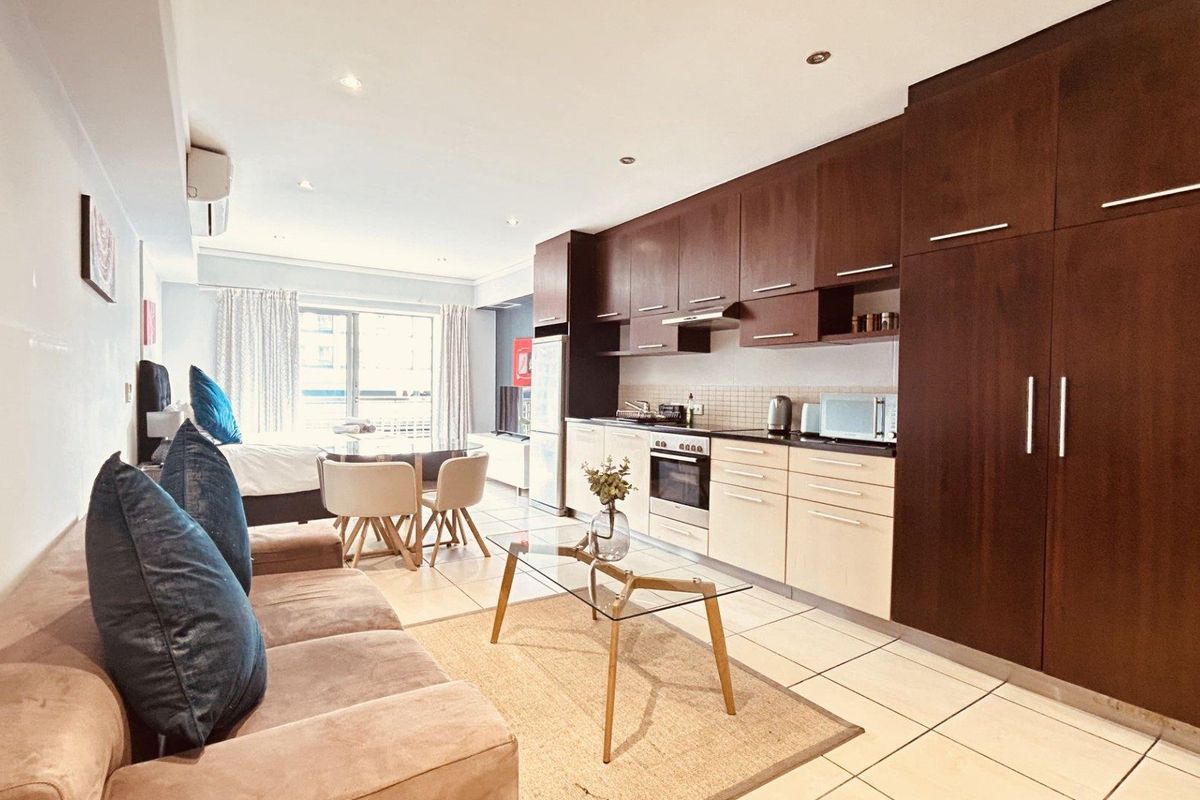 The apartment features a cleverly designed open-plan layout with air-conditioning throughout, creating a comfortable and functional living environment. The kitchen, dining, and living areas flow seamlessly into the sleeping area, separated by sliding doors, where you can enjoy charming glimpses of Table Mountain. Ample built-in storage enhances practicality, making excellent use of the space.