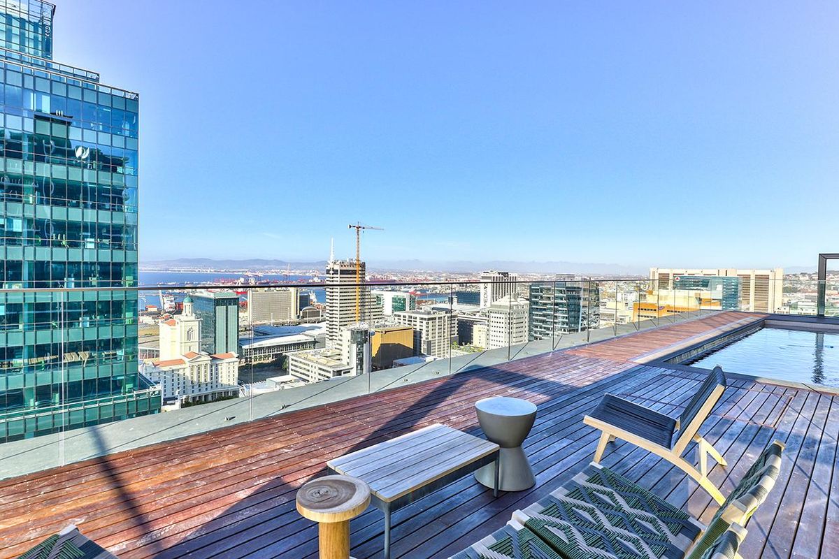 Live above the buzz on Bree Street in a trendy furnished Airbnb studio — rooftop pool, gym and panoramic Table Mountain and harbour views; includes one bathroom and parking.