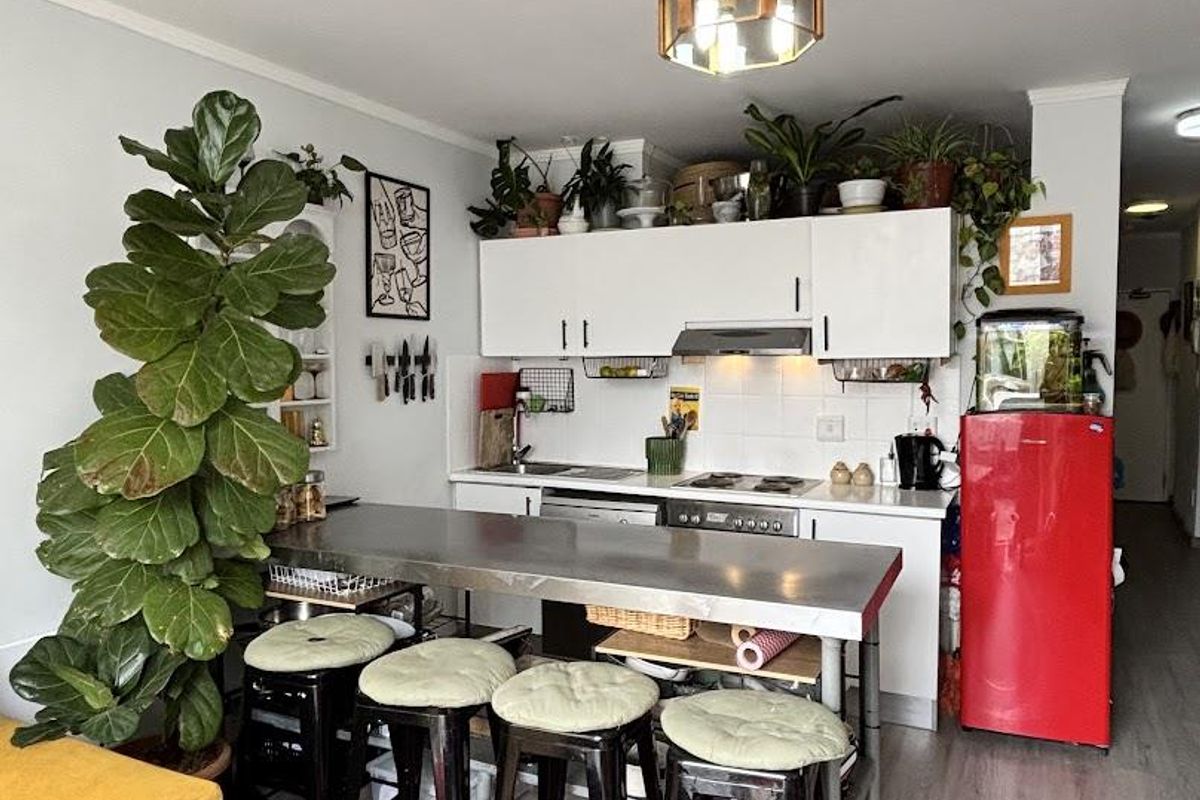 The kitchen is a dream for foodies complete with an oven, plumbing for dishwasher or washing machine, and large stainless steel counter for food prep and dining.