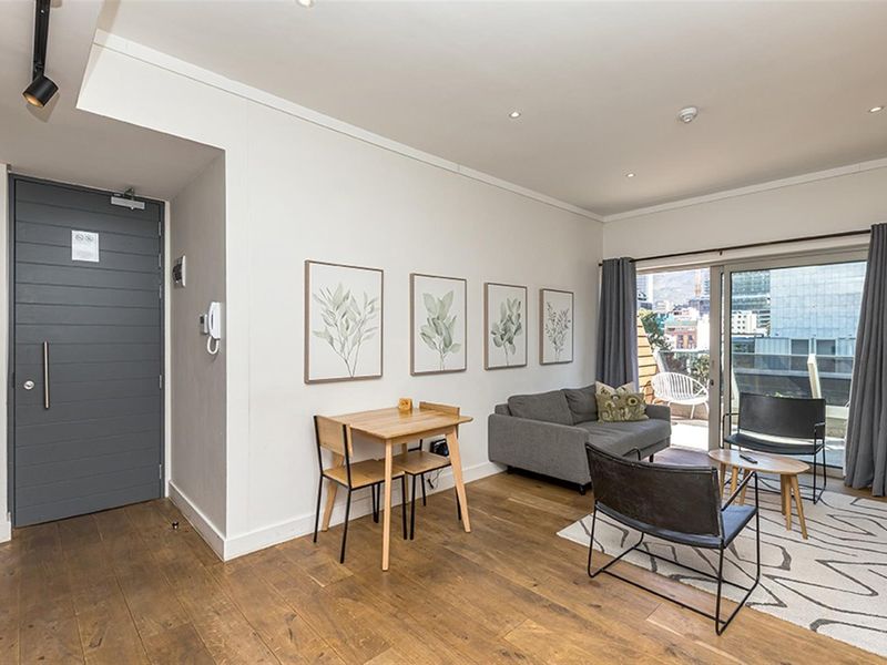Tap into Cape Town’s lively event and dining scene with this compact, furnished Keerom Street studio — architect-designed by Robert Silke, with a private balcony, one bathroom, no parking.