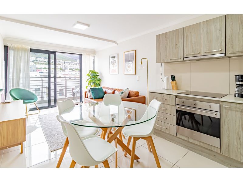 Live steps from Table Mountain, vibrant cafés and cultural landmarks in Cape Town’s Mother City — second-floor apartment with rooftop views of Table Mountain, open lounge, two bedrooms, secure parking.