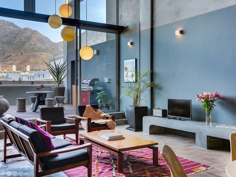 Live loft-style in Bree/Kloof Street with triple-high ceilings, mid-century modern finishes and a 28m² entertainer's balcony with mountain views; two en-suite bedrooms and tandem basement parking.