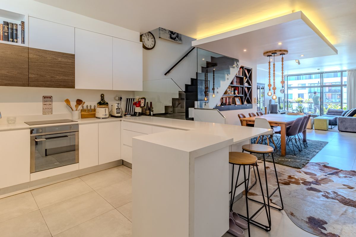 The lower level is flooded with natural light through floor-to-ceiling windows, showcasing stunning views of iconic Table Mountain and the harbour from your private balcony. Entertain in style in the sleek, modern kitchen that flows seamlessly into the expansive living area—perfect for hosting friends or simply soaking in the scenery.
