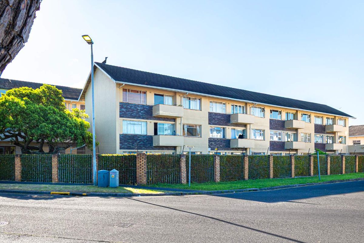 Sunlit apartment within easy reach of Harfield Village cafés, Claremont and Kenilworth shops; balcony overlooks manicured gardens. Open-plan kitchen, two bedrooms, one bath, open parking.