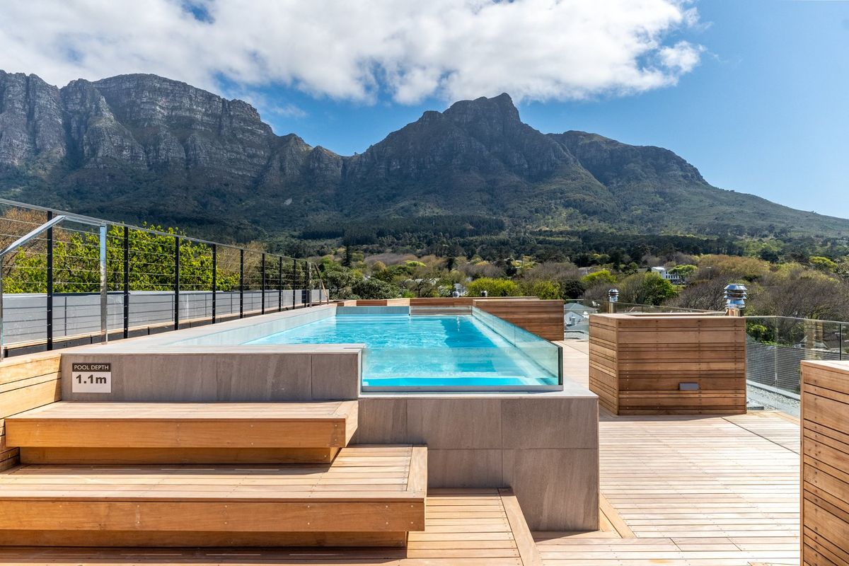 Embrace village living steps from Newlands Village with Table Mountain views, open-plan first-floor apartment featuring a designer kitchen with integrated appliances, communal pool and two basement parking bays.