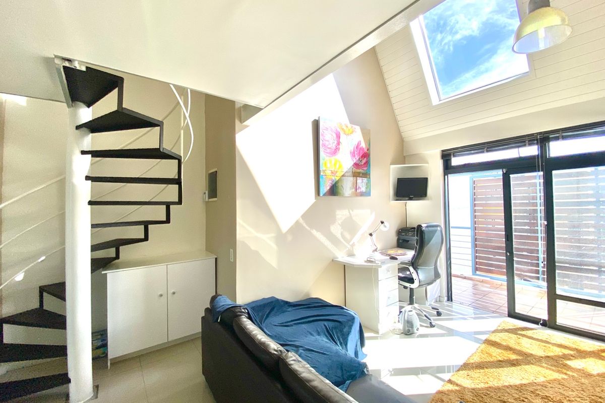 Very large north facing balcony that spans from the living area and is accessed through a glass sliding door. Beautiful spiral staircase leading up to the bedroom and is fitted with an air-con.