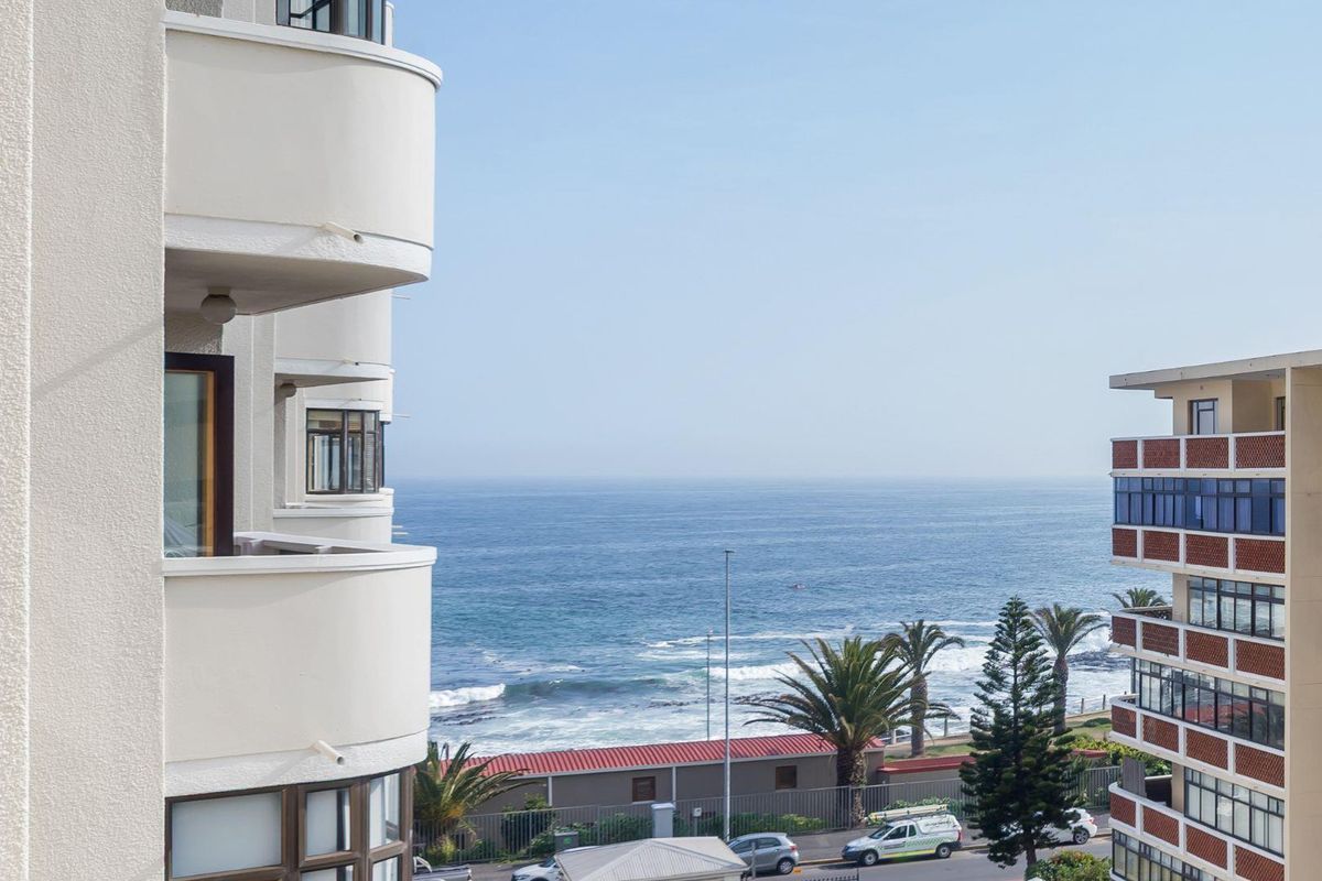 Beachfront living in Kingsgate on Beach Road, steps from the Sea Point Promenade; renovated sunlit apartment with balcony, gas braai and sea views — two bedrooms, one bathroom, basement parking.