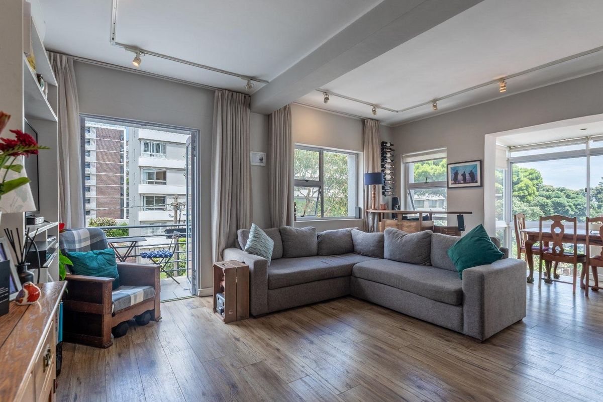 Relaxed coastal living steps from the Sea Point Promenade, with sun-filled living, balcony sunsets and access to a communal pool; three bedrooms, two bathrooms and a secure parking bay.