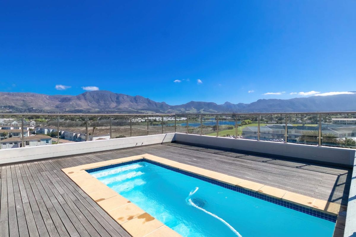 Sun-drenched, lock-and-go apartment ideal for professionals, north-facing with Constantiaberg views and a rooftop pool deck; modern Caesarstone kitchen with Smeg, two bedrooms, two baths, single parking.