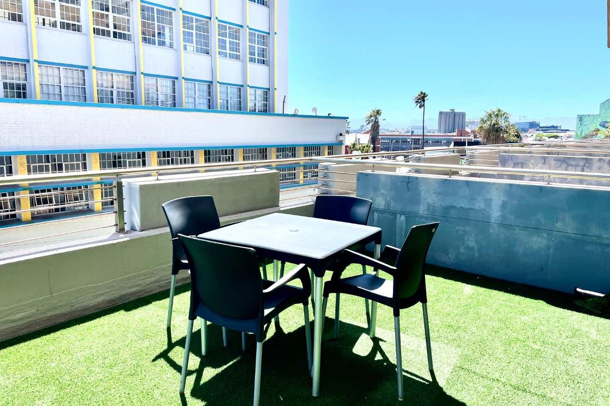 Entertain on a massive private terrace with harbour and Stellenbosch mountain views, moments from Old Biscuit Mill, cafés and Devil’s Peak Brewery — smart studio with one bathroom and secure parking.