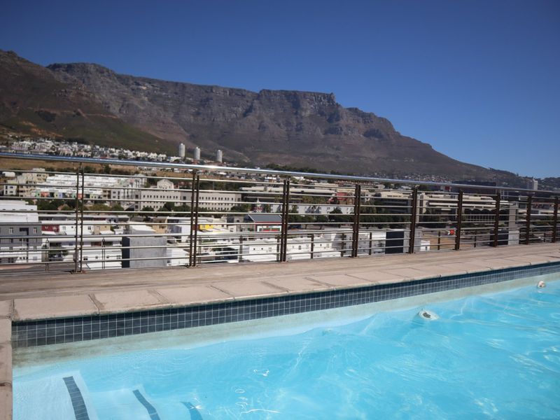 City Bowl living steps from the V&A Waterfront and universities at Chapel Towers in Zonnebloem, featuring a rooftop pool with 360° Table Mountain and harbor views; two-bedroom, one-bath, secure parking.