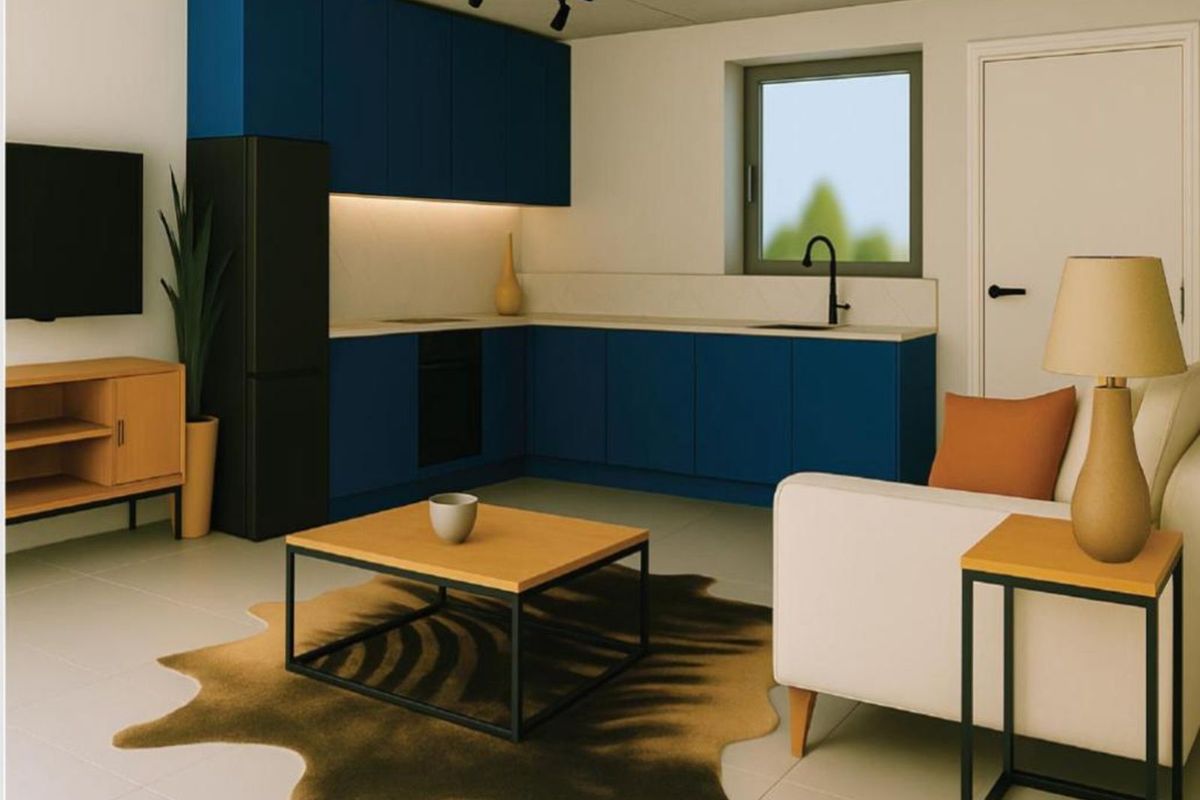 Modern open-plan living spaces featuring bold Kara Blue Peel cabinetry with sleek black handles