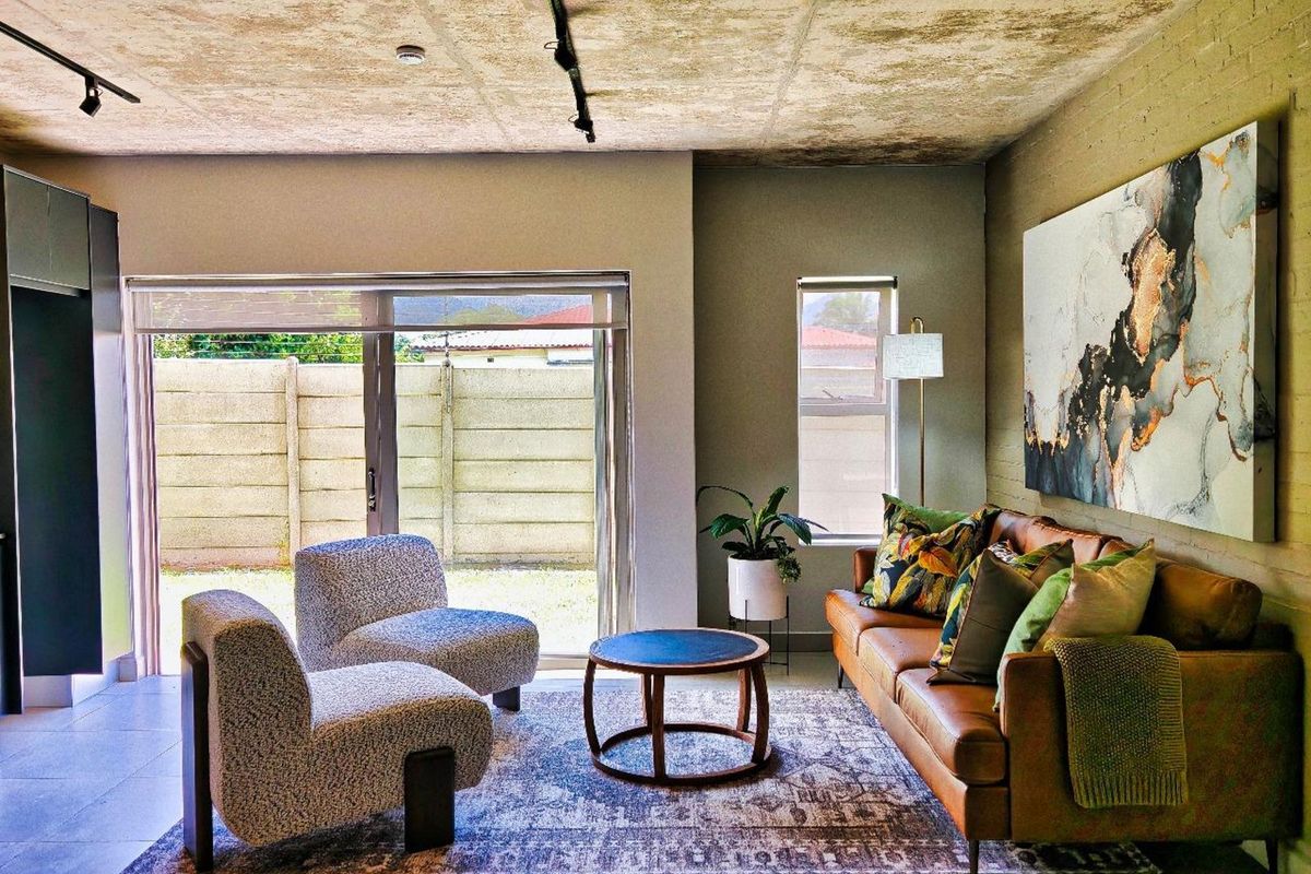 Effortless Garden Route living in George with a private ground-floor garden and industrial-style ceiling; contemporary open-plan kitchen, ideal lock-up-and-go for first-time buyers or Airbnb investors. Two beds, one bath.