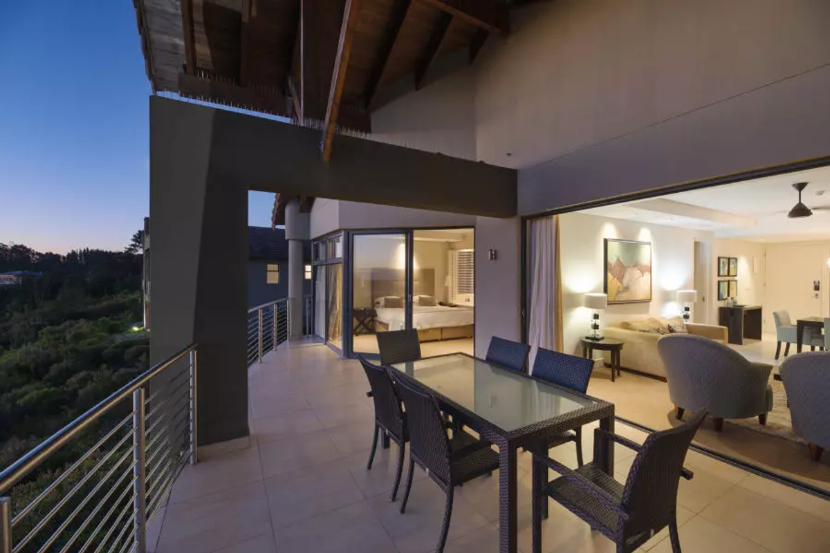 Resort-style living at Simola Hotel Country Club, overlooking Knysna and the Jack Nicklaus course; fully furnished two-bed, two-bath suite with covered barbecue patio and five-star facilities.