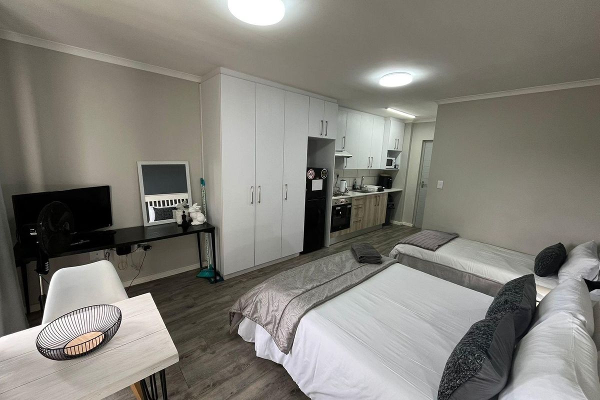 Embrace secure, low-maintenance estate living on Kuils River’s urban edge with Simonsberg views and a communal pool; modern open-plan studio with bathroom, parking bay and carport.