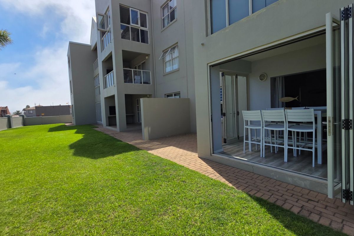 Beachside holiday living steps from Diaz Beach, shops and waterpark — ground-floor apartment with enclosed veranda and built-in braai, two bedrooms, one bathroom, shaded parking.