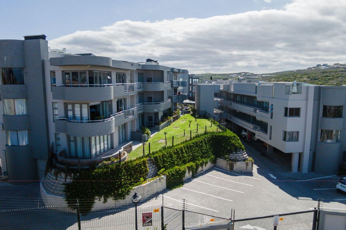 Seaside retirement retreat with panoramic mountain and ocean views, north-facing balcony for sunsets, secure complex minutes from Hartenbos and Diaz beaches — two-bedroom, two-bath with single garage.