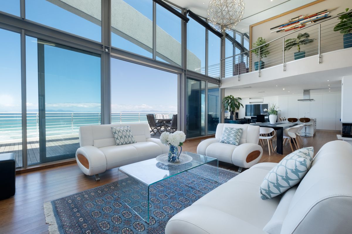 Daily Golden Mile beachfront living with panoramic False Bay views, expansive wrap-around balcony and enclosed jacuzzi, gourmet Siemens kitchen and three-bedroom, three-bathroom home with four-car garage.