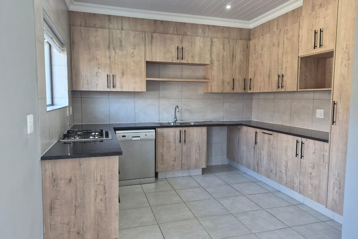 The property boasts a modern open-plan kitchen equipped with built-in cupboards, a sleek gas hob, and an electric oven, making it a delight for culinary enthusiasts. Adjacent to the kitchen is a spacious lounge area featuring a built-in braai, perfect for entertaining family and friends.