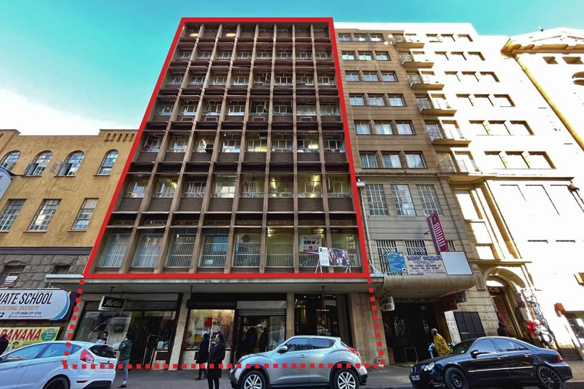Hands-off urban investment in Johannesburg’s fashion district, just 100m from Small Street Mall and major transport routes — fully tenanted building with ground-floor retail and multiple office floors.