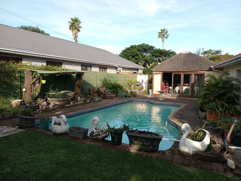 Coastal family living in Gonubie, steps from the boardwalk and beach, on lush gardens with a sparkling pool and thatched braai entertainment area; includes flatlet and four-car garage.